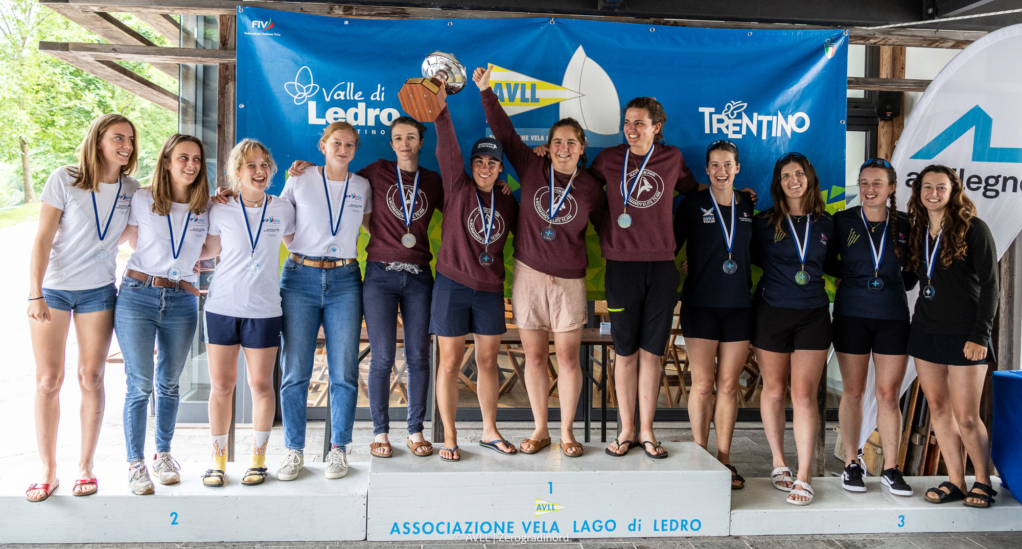 Mais la maigre risée qui s’était levée sur le plan d’eau, et qui avait permis l’envoi du 1er départ de course, a disparu sous les gouttes de pluie d’un grain qui a sonné le glas du championnat. C’est donc le résultat du Round Robin qui a désigné le podium de la compétition, offrant ainsi un doublé pour la France, avec la 1ère place des Match in Pink by Normandy Elite Team devant la Speedmeute de Kenza Coutard, également particulièrement solide sur ce Championnat pour s’offrir une première médaille internationale !