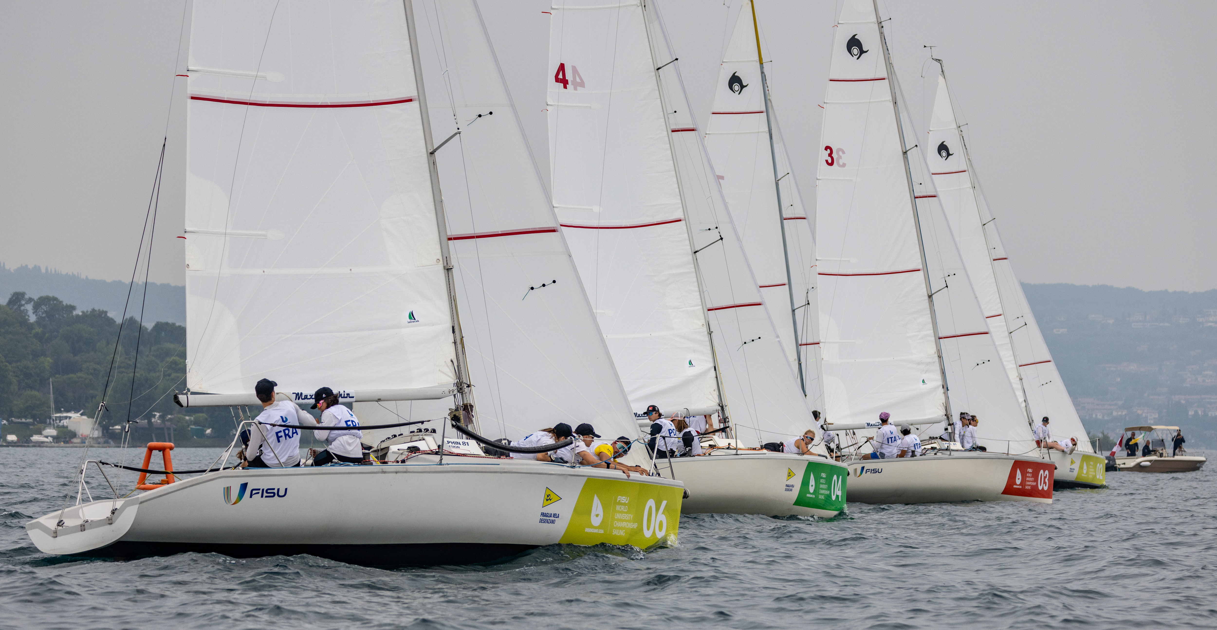 A peine sorti de ses examens pour valider sa 3e année en Médecine à Université Nice Sophia Antipolis, Ange Delerce était cette semaine à Desenzano del Garda, sur la rive sud du célèbre lac éponyme pour le Championnat du Monde Universitaire. 16 équipages représentants 14 nations venues du monde entier se disputaient le titre sur les 8 Dolphin 81 mis à disposition par le club du Fraglia Vela Desenzano. « On n’a pas eu beaucoup d’air de toute la semaine », raconte Ange Delerce. « Au final on ne fait que 9 courses en 4 jours. On venait d’universités différentes dans notre équipage, de médecine pour Lou-Anne (Morin) et moi, de STAPS-Sciences du Sport pour Sylvestre (De Guili Morghen) et Julien (Bunel), d’ingénierie pour Julia (D’Amodio) et de droit pour Alice (Chiappori) ».