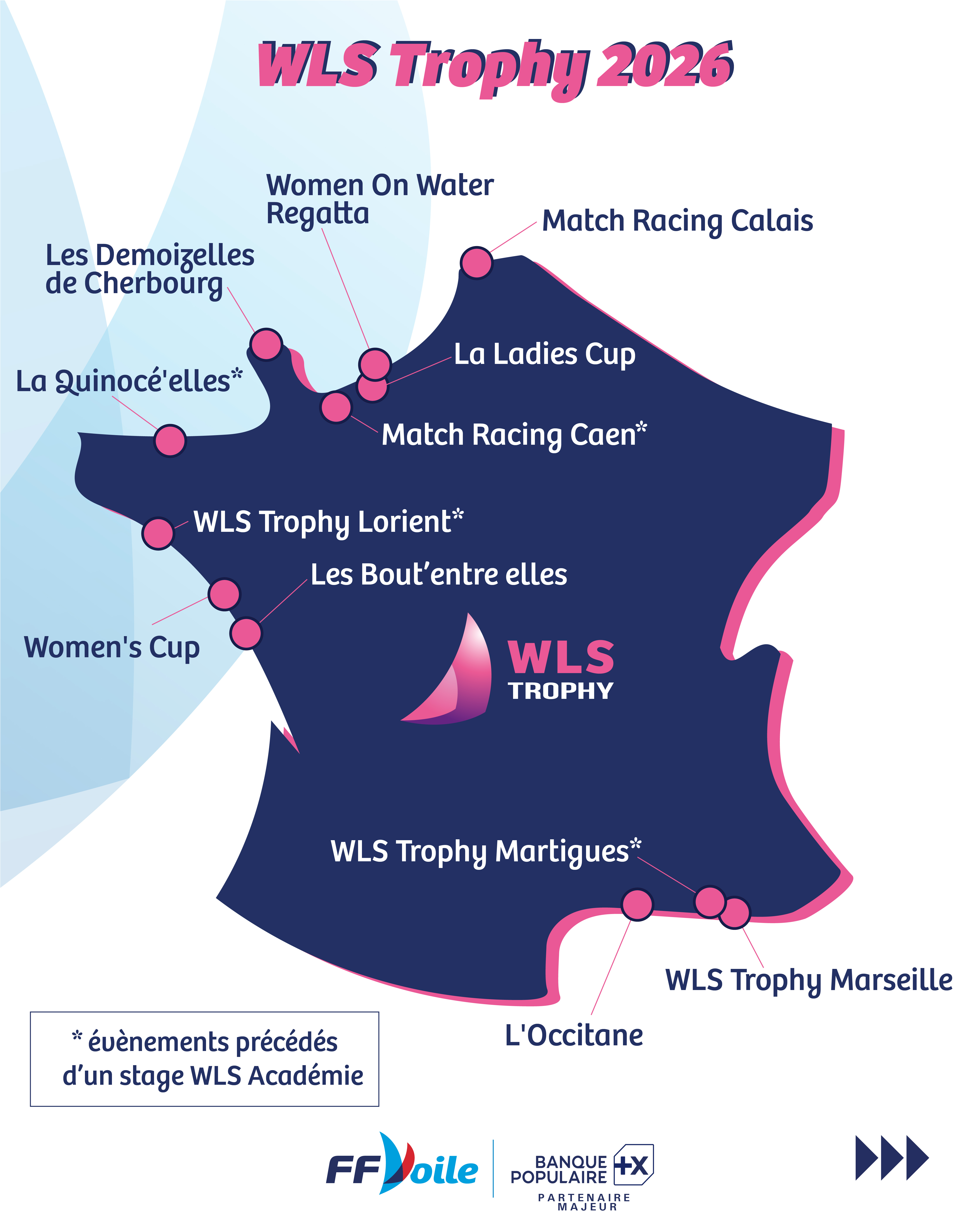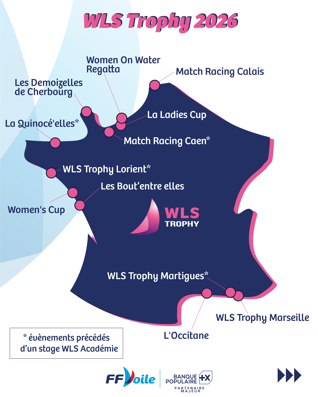 Véritable circuit de référence pour la voile féminine, le WLS Trophy propose tout au long de l’année des régates accessibles, sportives et conviviales, organisées dans des plans d’eau variés et portées par des clubs engagés dans la promotion de la pratique féminine. En 2025 ce ne sont pas moins 87 équipages (un record), soit plus de 400 filles qui ont pris part à au moins une de ces compétitions. Pour 2026, le WLS Trophy est de retour pour une 7e édition avec à nouveau 12 compétitions au programme !