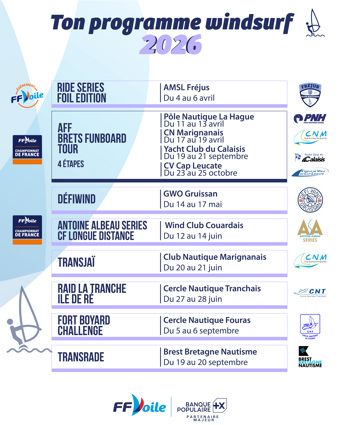 En parallèle de ces grands événements, le BRETS Funboard Tour AFF, avec ses quatre étapes réparties sur la saison, viendra structurer la pratique et offrir une dynamique de circuit complémentaire. La saison Funboard 2026 promet une année complète, intense et fédératrice, où passion, performance et esprit de défi seront au cœur de chaque navigation. Une saison incontournable pour tous les amateurs de glisse et de sensations fortes.