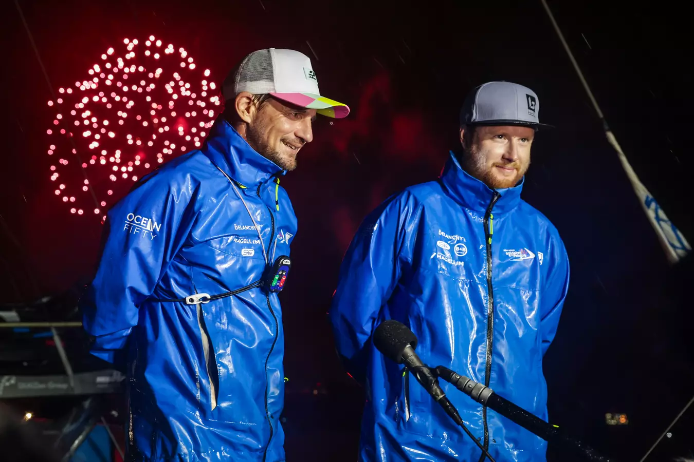 Trempés jusqu’aux os ! Le public a eu un petit aperçu de ce qu’est un grain antillais et des dernières heures de course que Thibaut et Quentin ont vécu avant de franchir la ligne en vainqueurs. Après une première réaction au ponton, c’est en salle de presse et au sec que se poursuivait l’entretien avec un binôme heureux de tenir entre ses mains la victoire qui leur avait tous deux échappés entre Saint-Malo et Pointe à Pitre il ya tout juste un an.